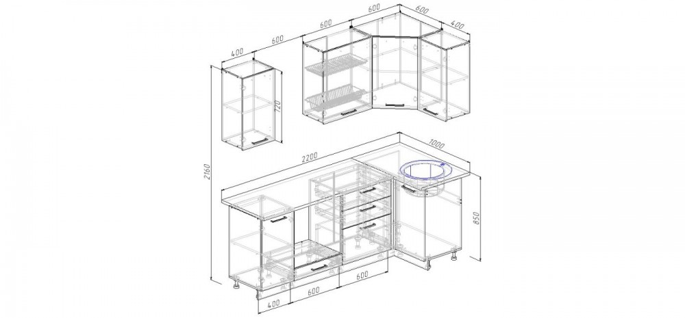 Фасады верхних модулей со свесом 12 мм дают возможность использовать без установки ручек.